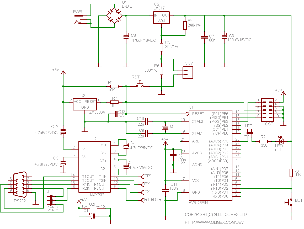 - STK200 compatible ICSP 5x2 pin connector for in-circuit programming with AVR-PG1 or AVR-PG2